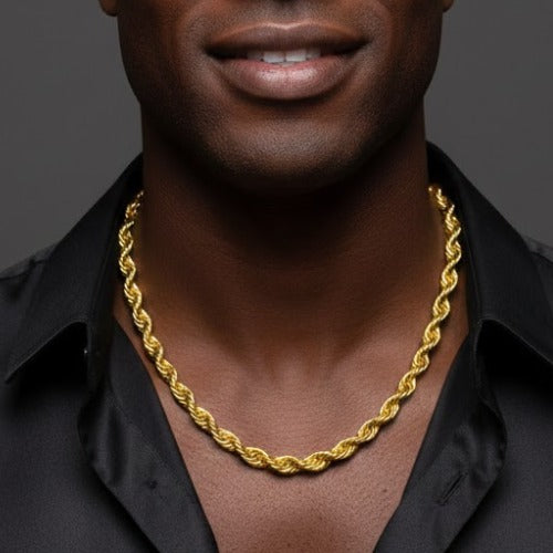 This premium 14K Yellow Gold Rope Chain features a bold 6mm width, a classic 20-inch length, and a solid 107 grams of rich yellow gold. Crafted with a tightly twisted rope design, this chain delivers exceptional shine, durability, and a luxurious heavyweight feel. Its iconic rope texture and polished finish make it a standout statement piece perfect for men who want a powerful, sophisticated, and authentic solid gold chain.