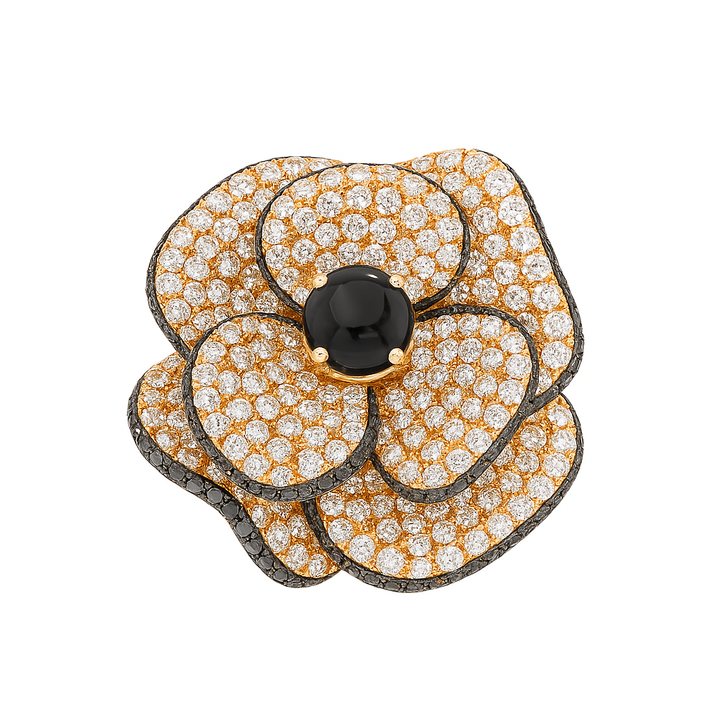 A luxurious natural diamond flower ring featuring black and white round diamonds in an elegant Ant-style design. Crafted in 18K yellow gold, this 6.80-carat statement ring radiates timeless beauty and bold sophistication.Details: