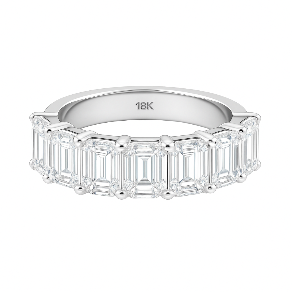The SEPTET Emerald Ring in 18K Gold is an unparalleled masterpiece of symmetrical luxury and monumental grandeur. The name SEPTET (a group of seven) highlights the perfect alignment of the magnificent stones, creating an unbroken band of light. This spectacular piece features seven meticulously matched Emerald Cut Diamonds, totaling an extraordinary 6.07 Carats. Set in high-purity 18K Gold, the design emphasizes the geometric precision of the step-cut facets, which flow into one continuous band of dazzling flashes (the "Hall of Mirrors" effect). The 6.07 CT weight is distributed beautifully across the hand, offering more finger coverage and drama than a single-stone ring. This ring is a defining collector's piece, reserved for those who demand architectural perfection, immense scale, and historic elegance.